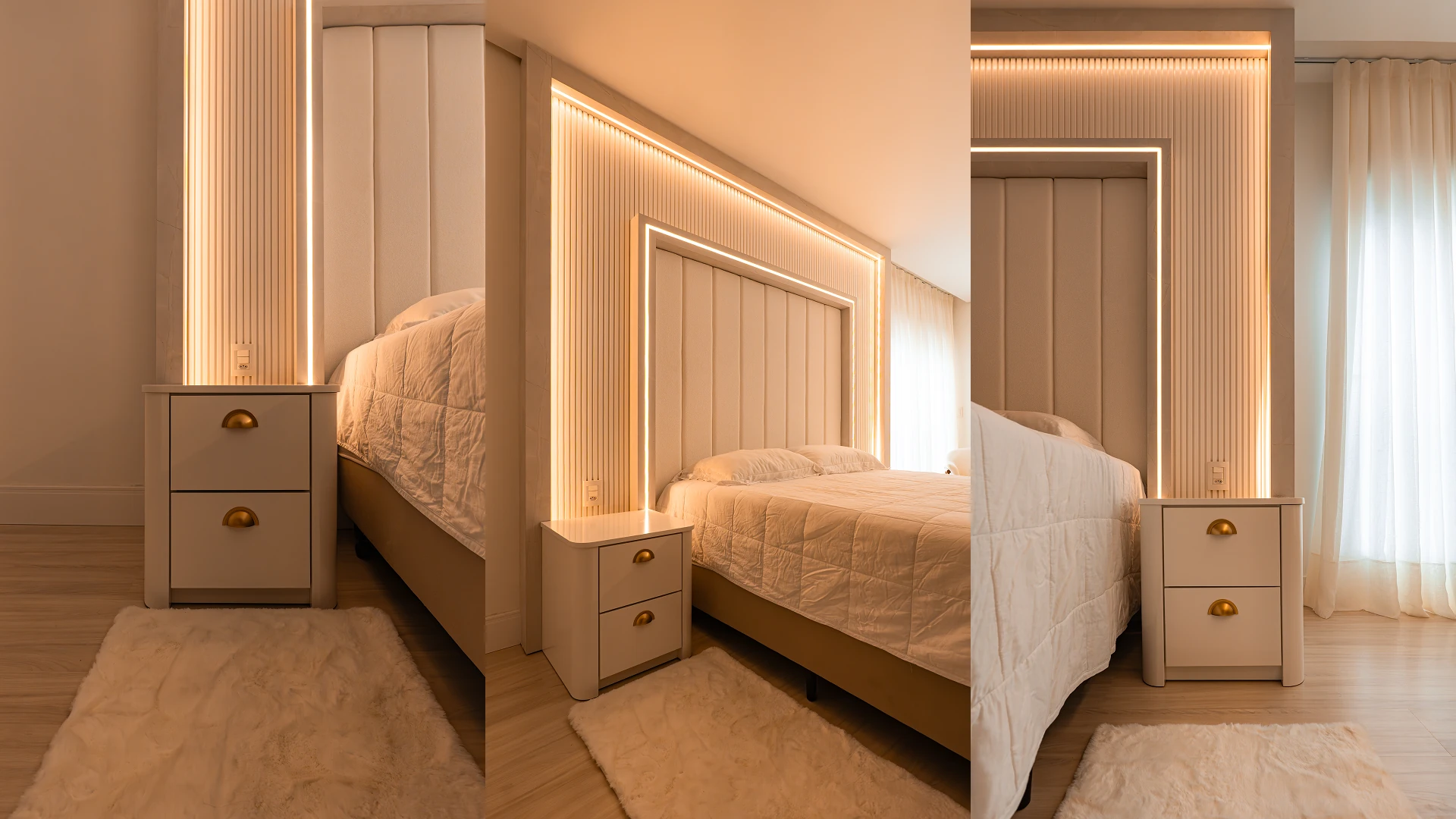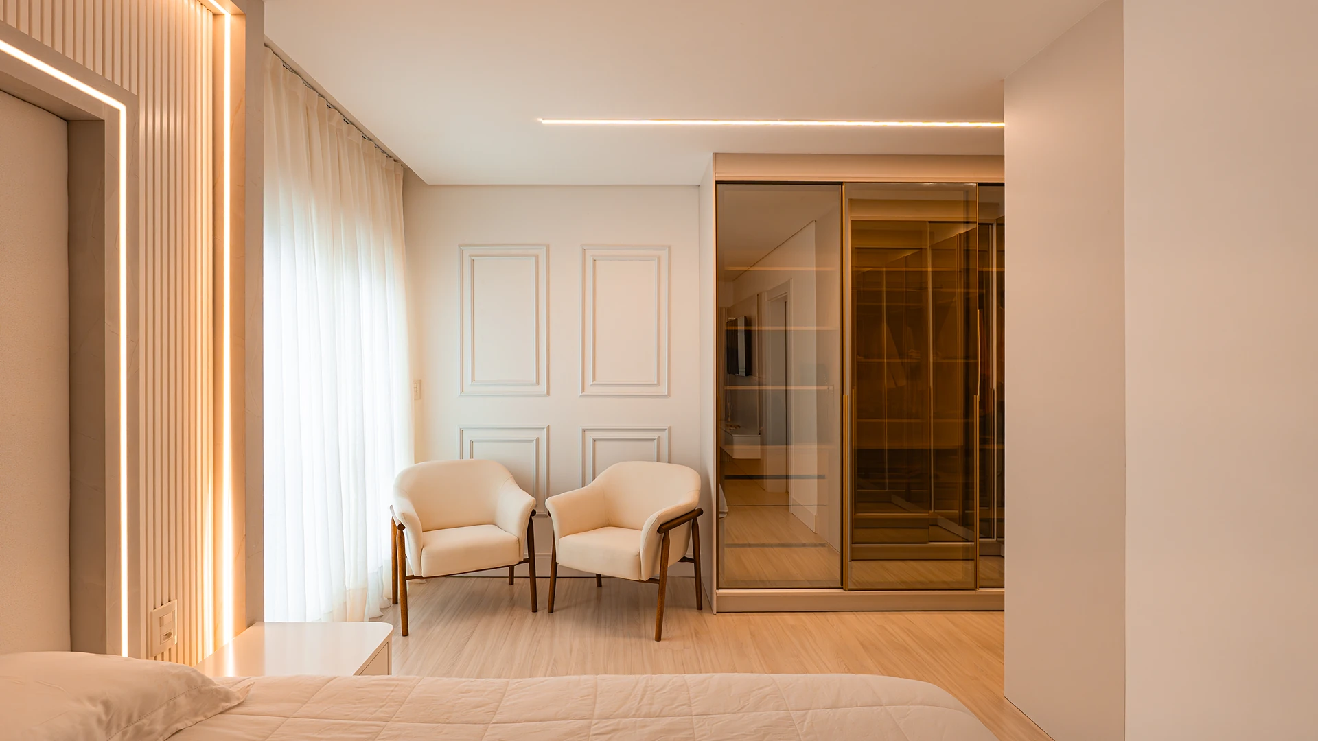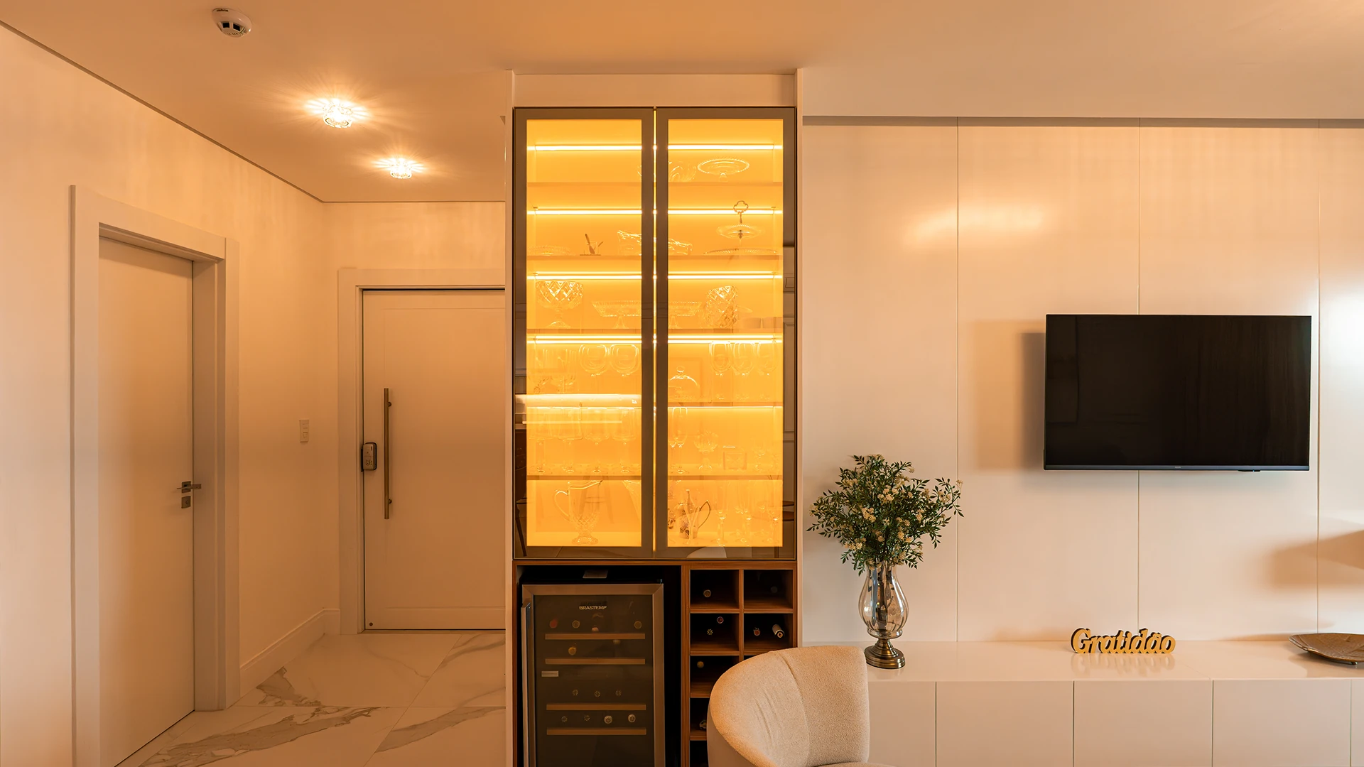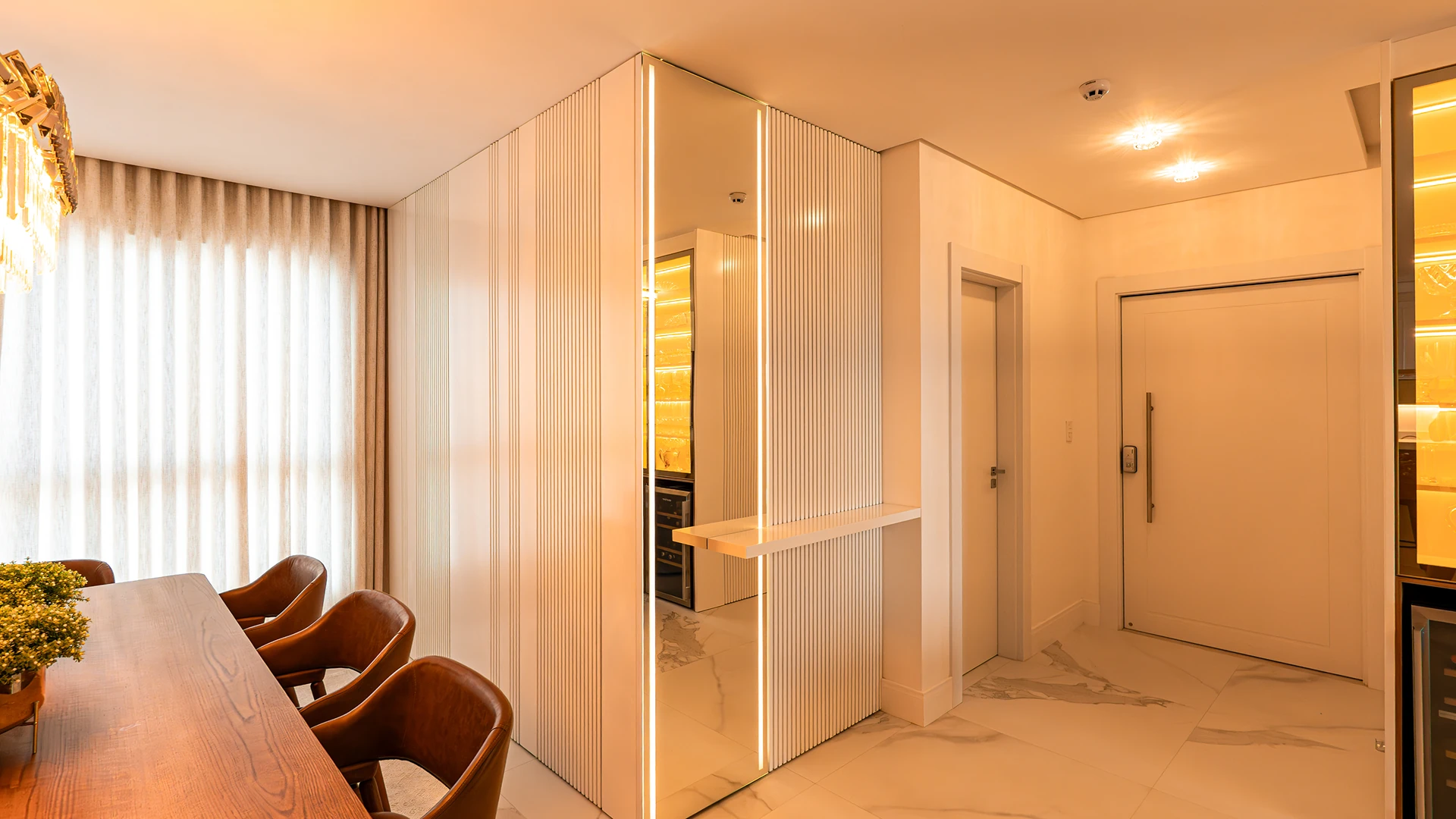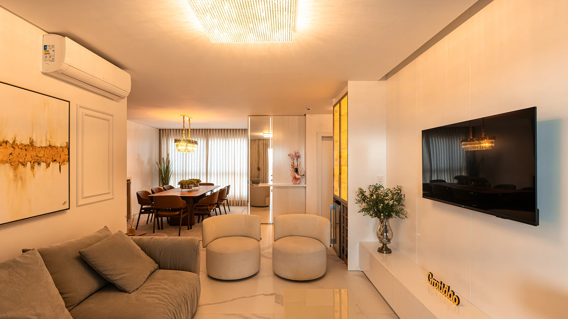Do hall à suíte master, cada ambiente foi pensado com sensibilidade e técnica: espaços integrados, marcenaria protagonista com pintura branca e volumes sutis, iluminação bem planejada e escolhas que equilibram textura, movimento e funcionalidade.