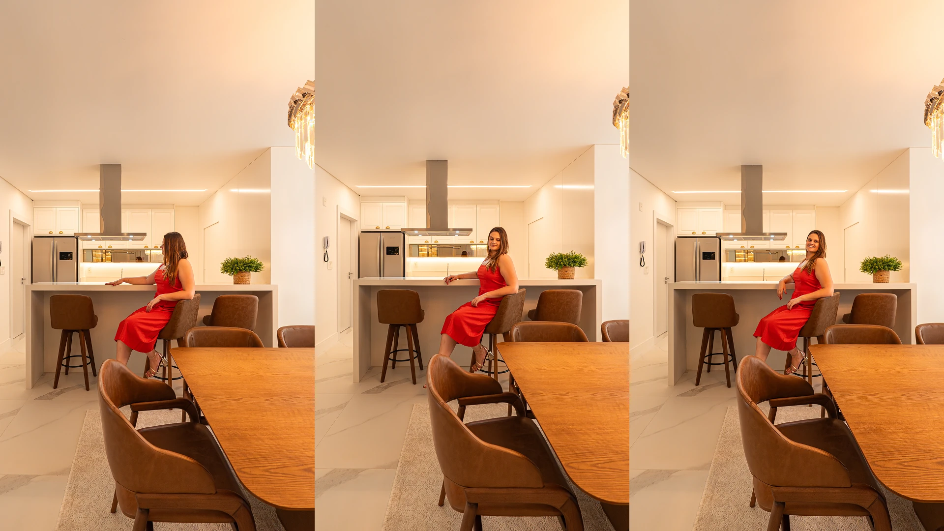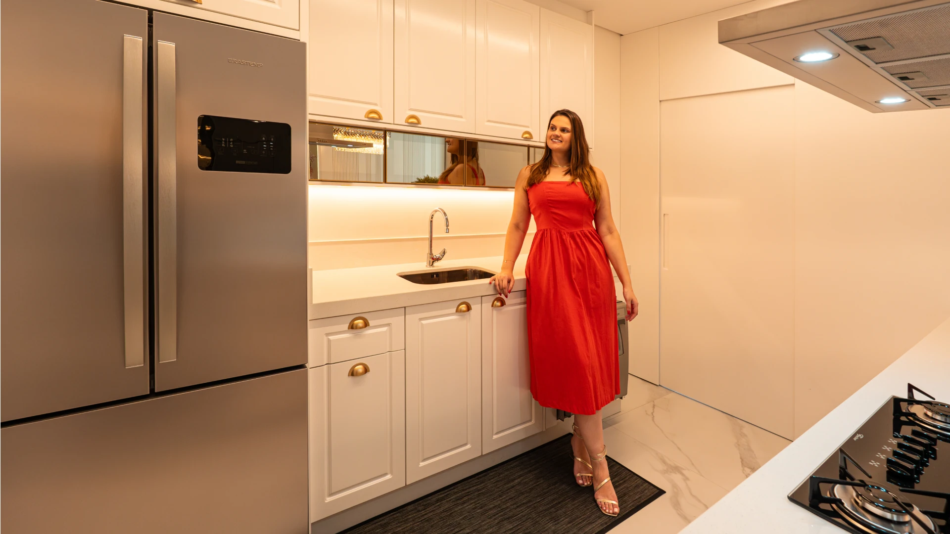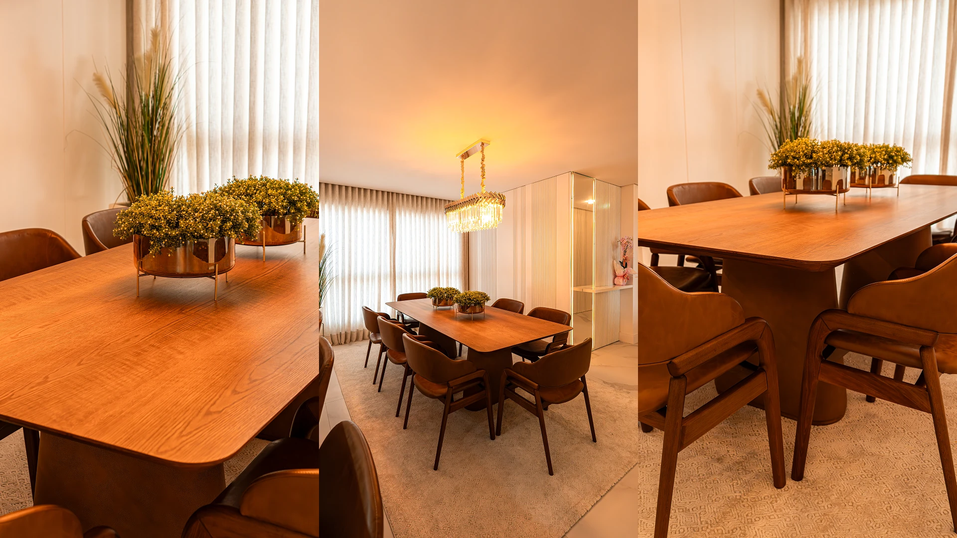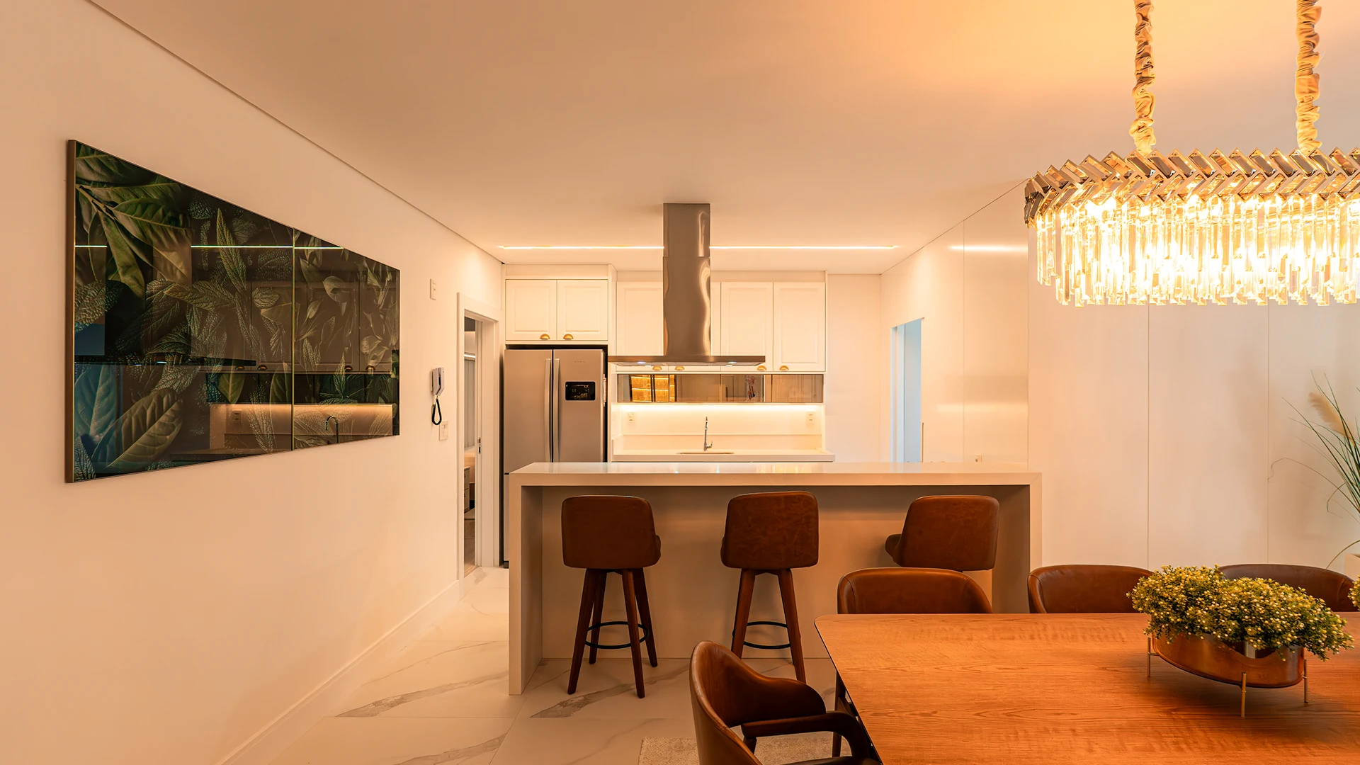 A integração do setor social, a delicadeza dos acabamentos na cozinha e o conforto das suítes traduzem um projeto maduro e contemporâneo, que respeita a rotina e os desejos da cliente em cada detalhe.